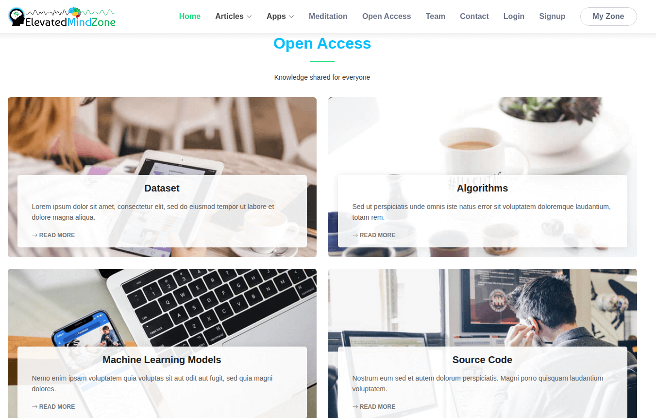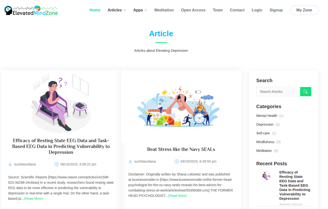 ElevatedMindZone (EMZ) is a comprehensive web application built with Angular, designed to be a supportive content space for individuals dealing with depression and a valuable resource hub for mental health researchers. The platform combines a full-featured Content Management System (CMS) with a suite of interactive, therapeutic web applications. The project's mission is to provide accessible tools and knowledge to help users "embrace their inner radiance" while also offering a platform for researchers to share and disseminate their work.